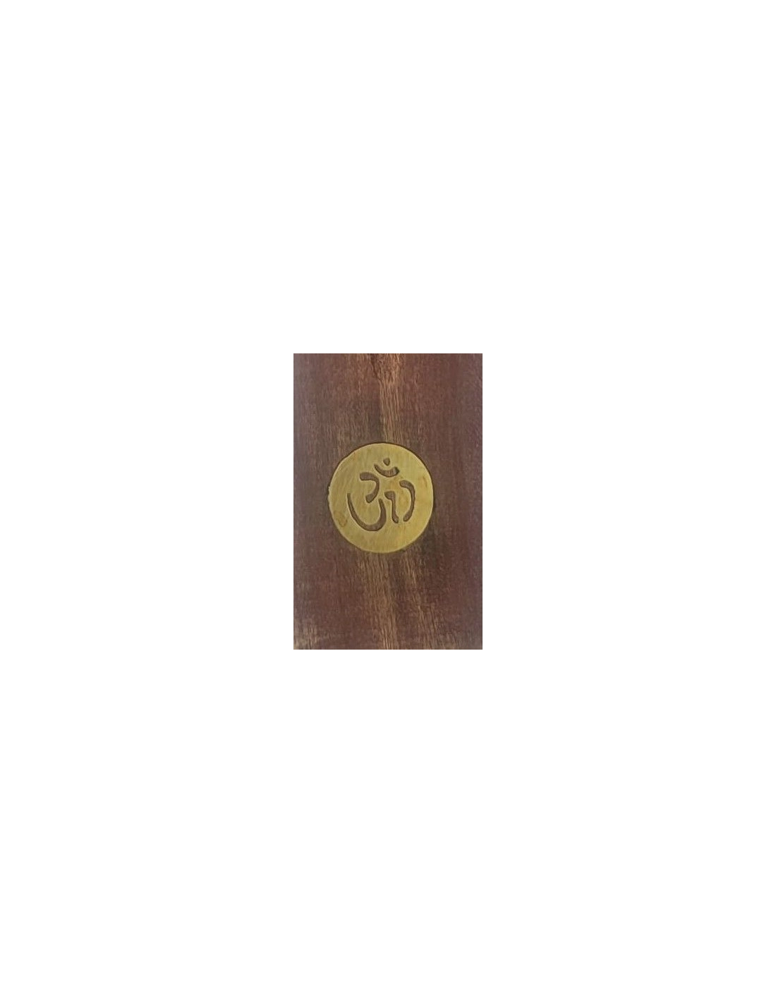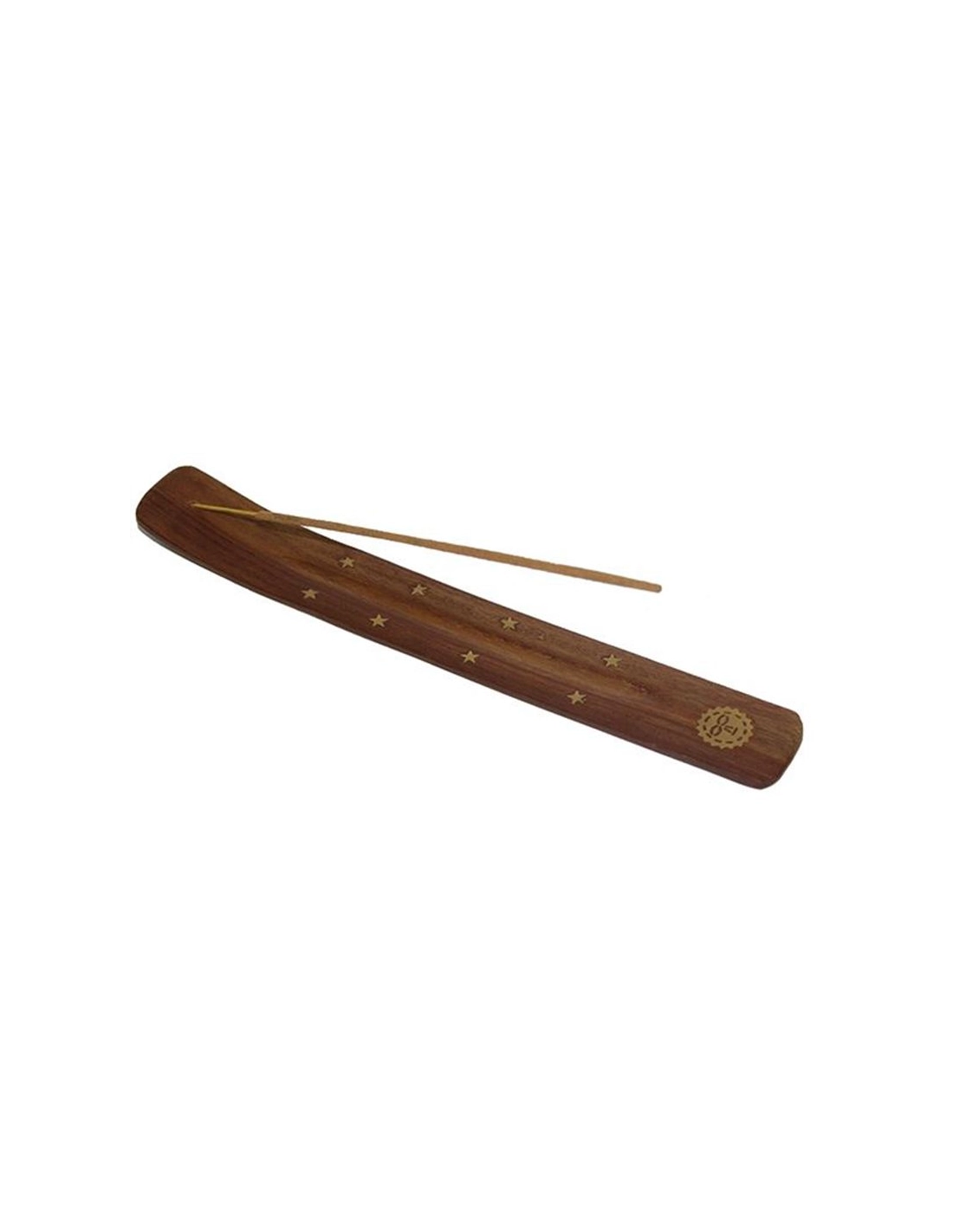Räucherstäbchenhalter aus Holz zum Abbrennen eines Räucherstäbchens mit goldenem Motiv als Dekoration.