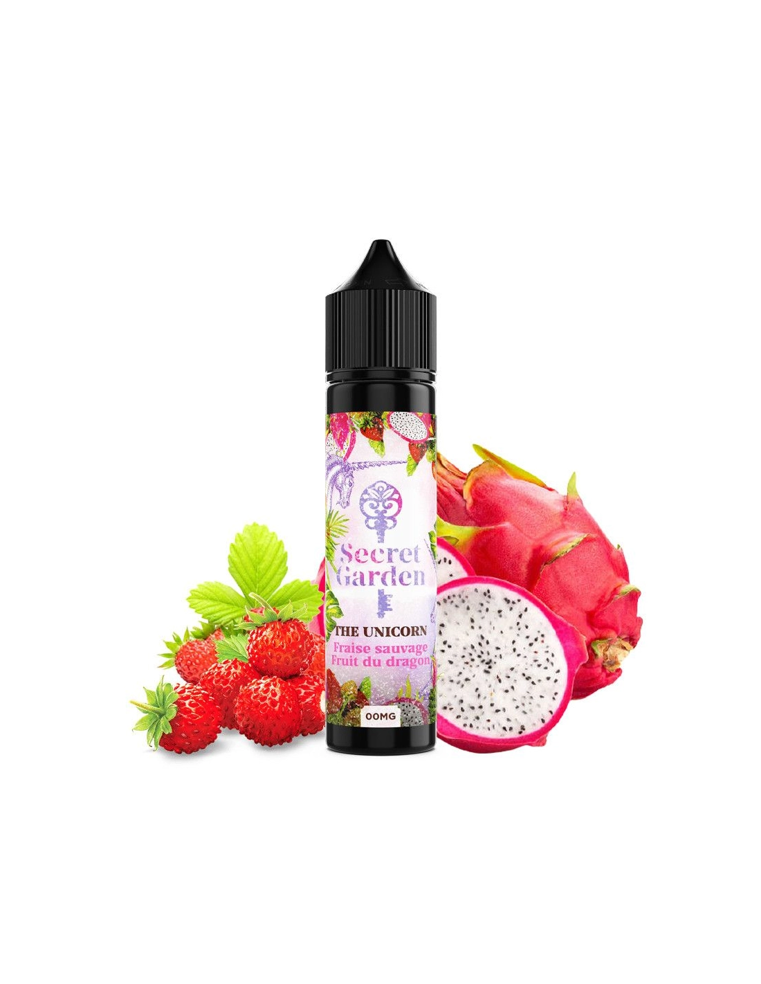 Das E-Liquid The Unicorn aus der Reihe Secret Garden der französischen Hersteller von Secret's Lab, das sind fruchtige Aromen von Drachenfrucht und Erdbeere.
