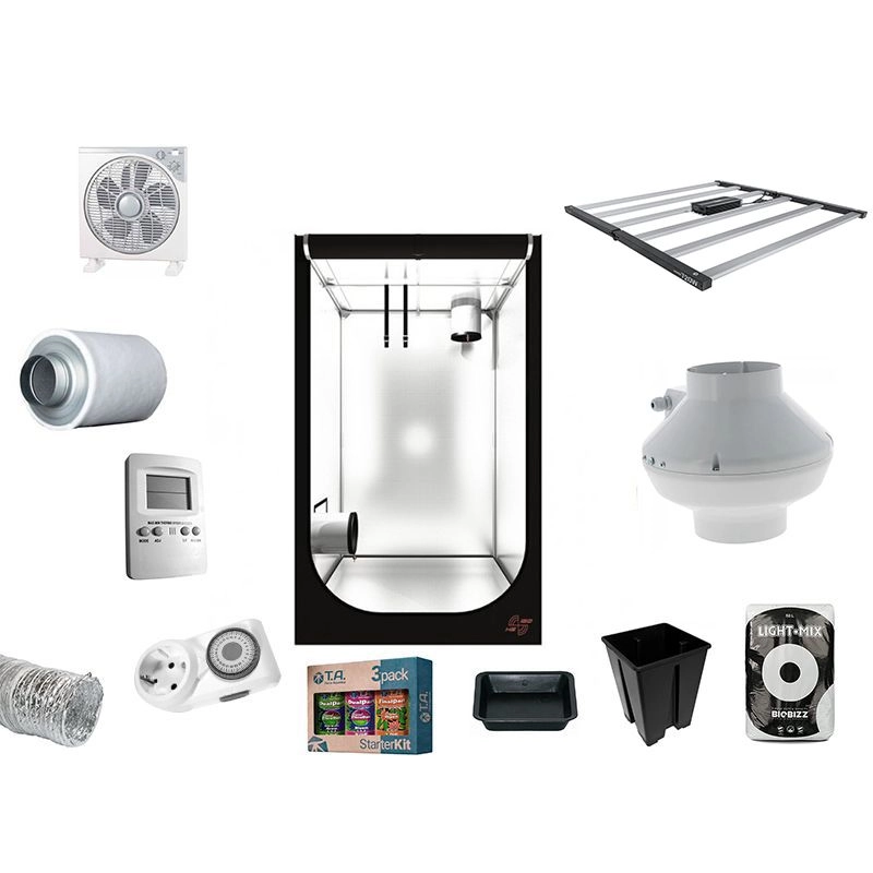 Vollständiges Grow-Set mit dem Hydro Shoot 120 Zuchtschank in den Massen 120 x 120 x 200cm sowie der LED-Lampe Lumii 720 mit einer Leistung von 660 W. Das Angebot umfasst die gesamte Ausrüstung für eine erfolgreiche Indoor-Zucht mit 25 Töpfen à 3,6 l.