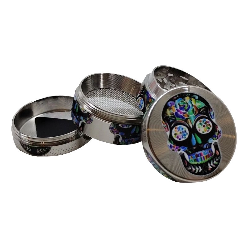 Champ High Grinder ist ein 4-teiliger Grinder mit einem Durchmesser von 40mm, mit dem du die Pollen deiner CBD ernten kannst. Dieser wunderschöne Grinder ist mit mexikanischen Totenschädeln mit Regenbogenblumen verziert.