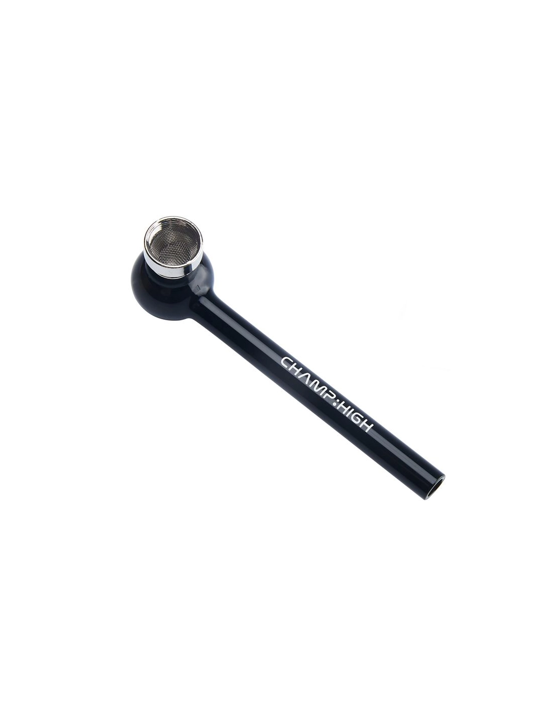 Eine schwarze Glaspfeife, die mit einem Metallkamin ausgestattet werden kann. Diese Pfeife ist praktisch und lässt sich überall hin mitnehmen.