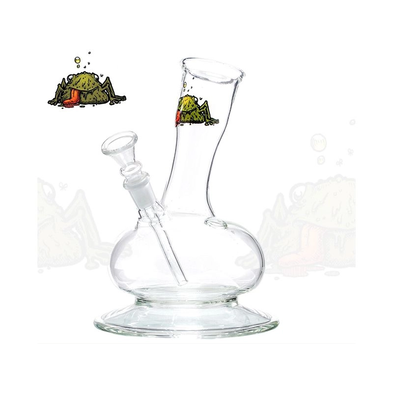 Glasbong mit einer Höhe von 22cm und einem 45mm-Mundstück mit einem eingedrückten Frosch auf der Vorderseite. Die Bong hat einen Brennpunkt mit einem Durchmesser von 14,5mm und lässt sich leicht ziehen.