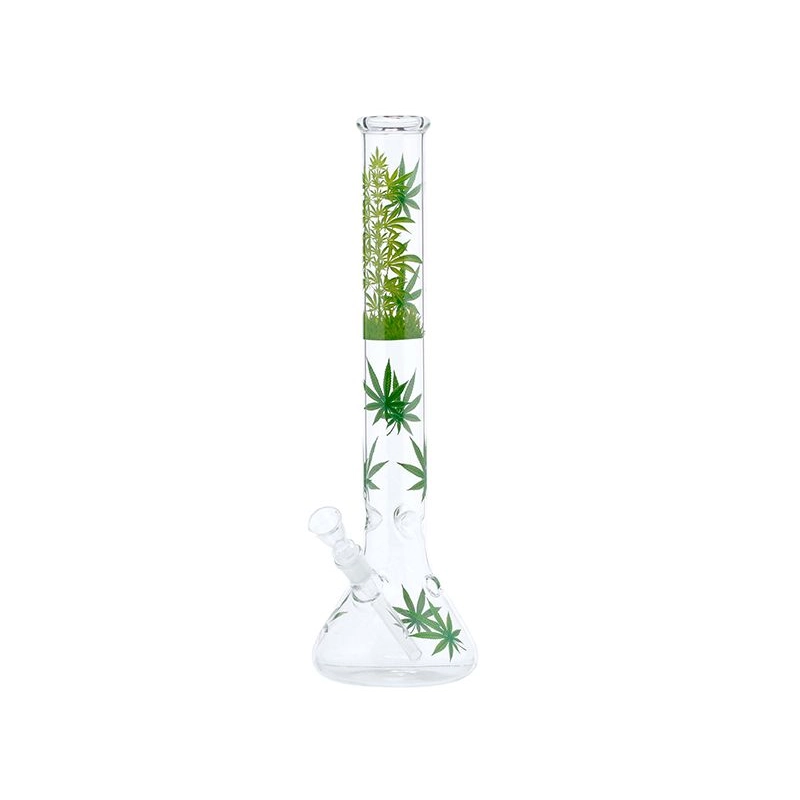 45 cm hohe Glasbong mit Cannabisblättern auf der Oberseite. Die Brennkammer, in die du dein CBD gibst, hat einen Durchmesser von 18,8 mm, was dir einen luftigen Zug ermöglicht.