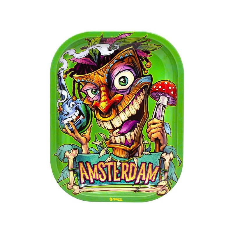 Grünes G Rollz Metall-Mix-Tablett mit dem Bild einer Kreatur, die eine Wasserpfeife und einen halluzinogenen Pilz hält, mit den Maßen 14 x 18 cm und abgerundeten Kanten.
