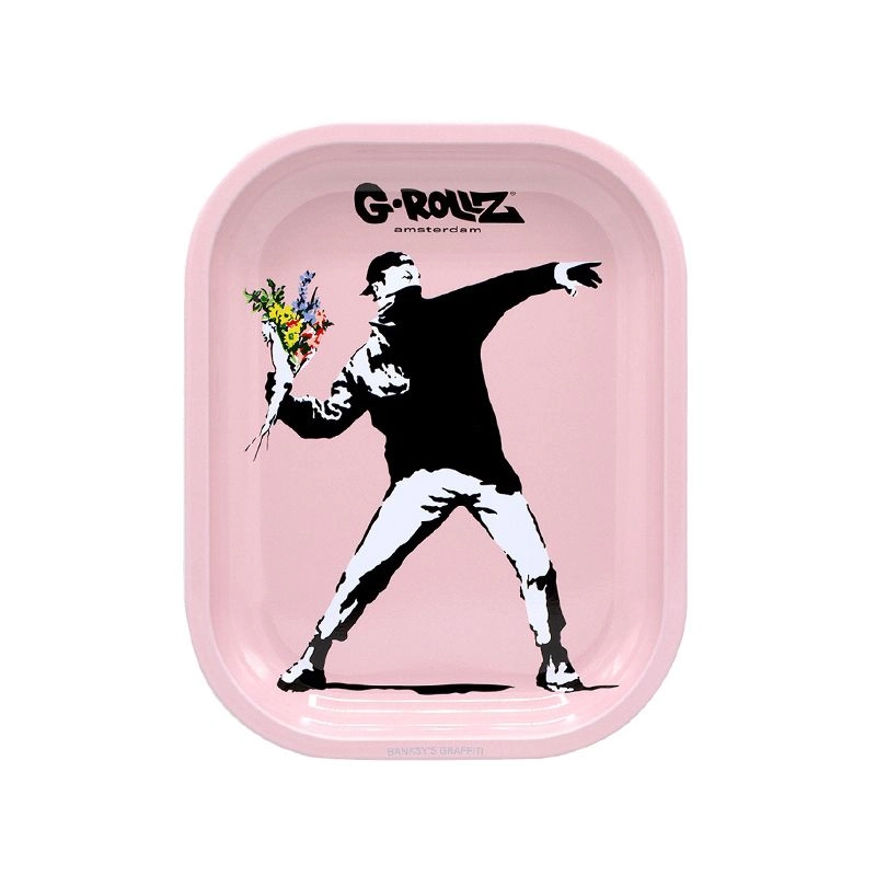 Mixtablett aus Metall mit einer Größe von 14 x 18 cm mit dem Bild eines Banksy-Kunstwerks, das einen Demonstranten zeigt, der einen Blumenstrauß wirft.