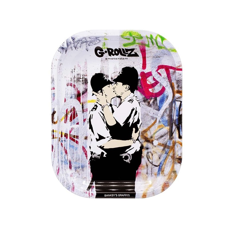 14 x 18 cm großes Mixtablett aus Metall mit dem Bild eines Banksy-Kunstwerks, das zwei sich küssende Polizisten zeigt.