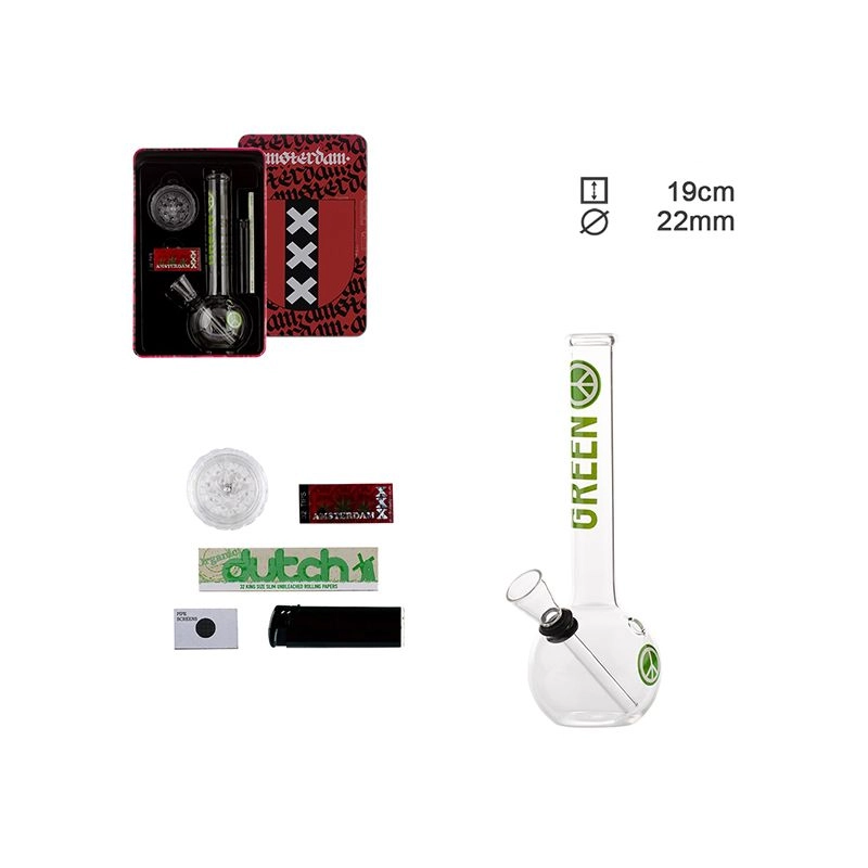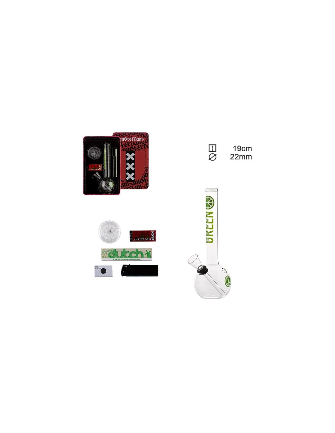 Geschenkset mit einer 19cm hohen Bong und Zubehör, ideal zum Rauchen deiner Lieblings-CBD. Diese Bong verwendet einen Feuerraum mit einem Durchmesser von 14,4mm und einer Dicke von 3mm.
