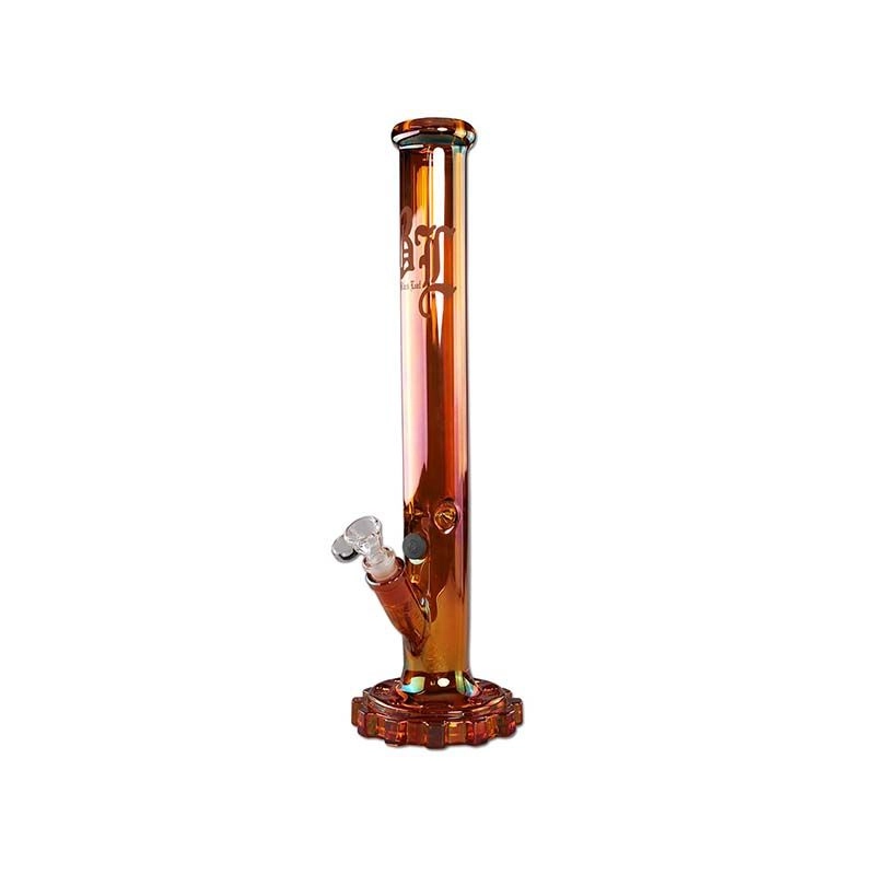 Selbstverständlich hat auch die Gear von Black Leaf den außergewöhnlichen, markenrechtlich geschützten Bongfuß in Zahnradform. Robust und schwer, gibt er der coolen Glasbong stabilsten Stand sowie einen einzigartigen Look. Letzterer wird durch das irisierende, kupferfarbene Glas mit schimmernden Metalliceffekt und dem sechskantigen Glasrohr effektiv betont.