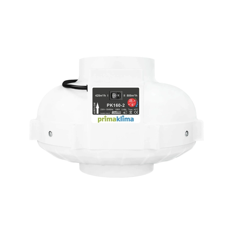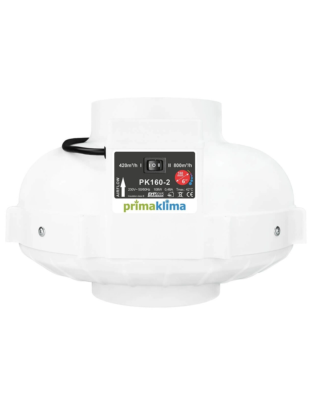 Der 2-Stufen Rohrventilator PK-125-2 von Prima Klima eignet sich hervorragend als güstige Variante, um beispielsweise das Klima bei der Indoorgrow Zucht zu beeinflussen. Der Ventilator kann sowohl für die Abluft als auch für die Zuluft genutzt werden.
