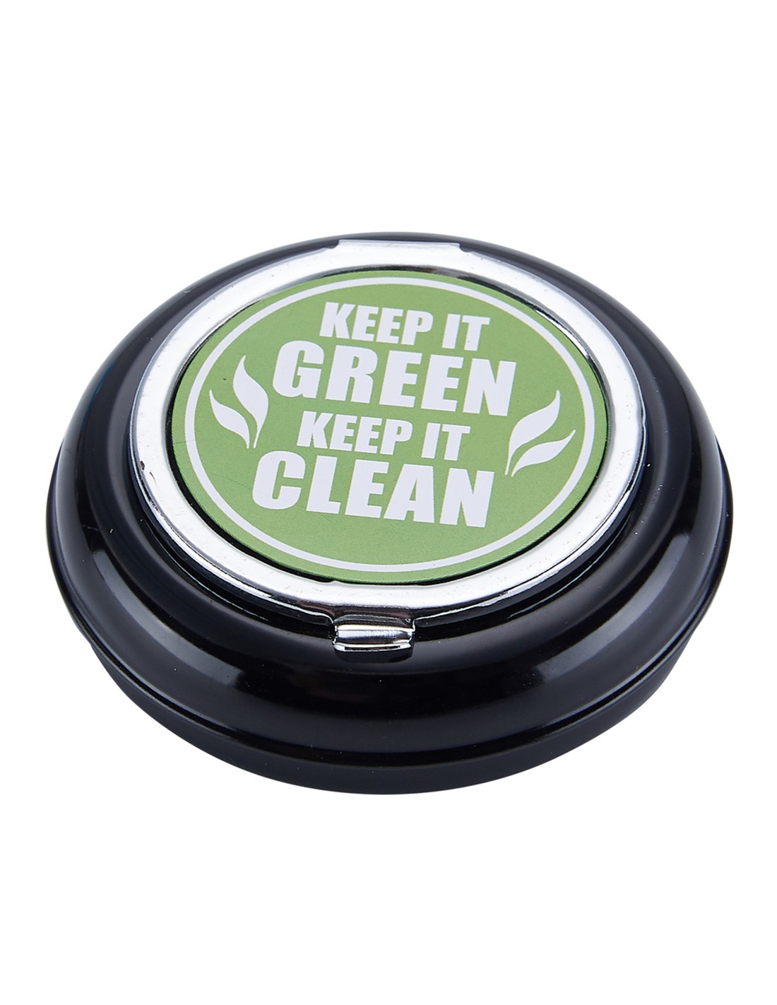 Tragbarer Aschenbecher aus schwarzem Metall mit einer Vertiefung im Inneren, in der Sie Ihren Joint oder Ihre Zigarette ausdrücken können.