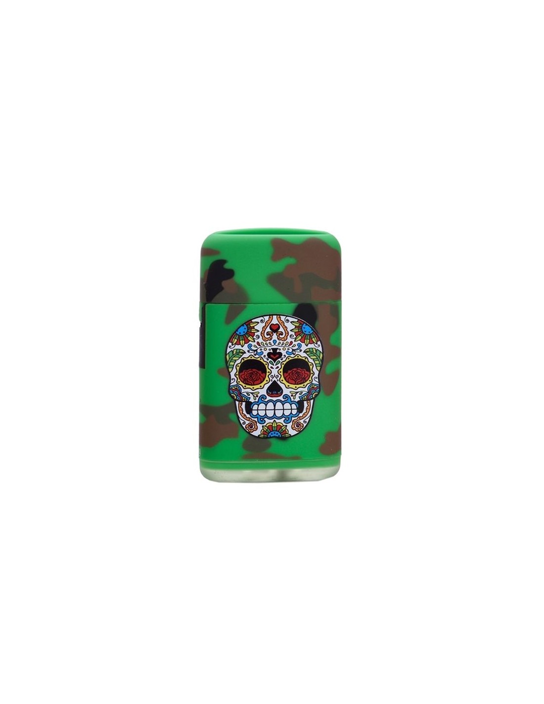 Nachfüllbares Sturmfeuerzeug mit Klappe (wie bei einem Zippo) in Grün mit mexikanischem Totenkopfmotiv.